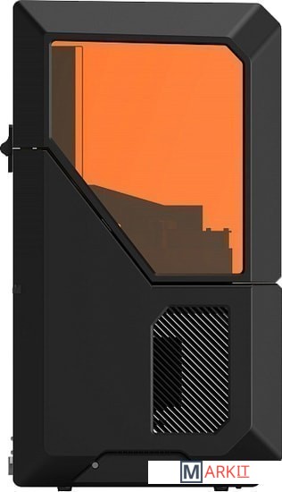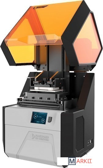 Гладкость краев модели обеспечивается за счет технологии компенсации. При необходимости платформу можно отсоединить и заменить. Принтер не требует калибровки и совместим с третьим поколением фотополимерных смол. Скорость печати 10 мм/час.