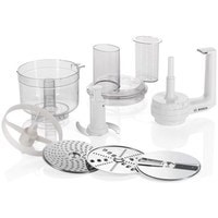 | Комплектация | - двусторонний диск-терка (крупная/мелкая); - двусторонний диск-шинковка/ломтерезка (крупная/мелкая); - терка для сыра твердых сортов, шоколада; - нож-измельчитель;- держатель для дисков. |